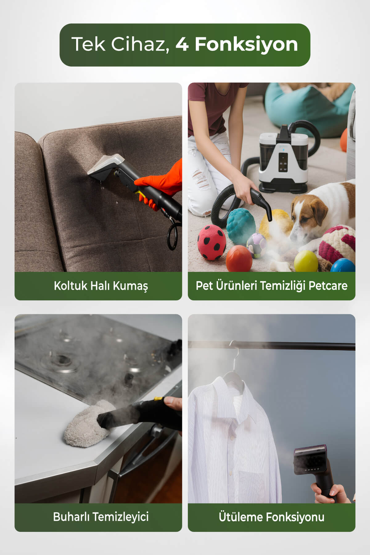 Halı, koltuk, perde ve kumaş yüzeylerde etkili ve pratik temizlik sağlar