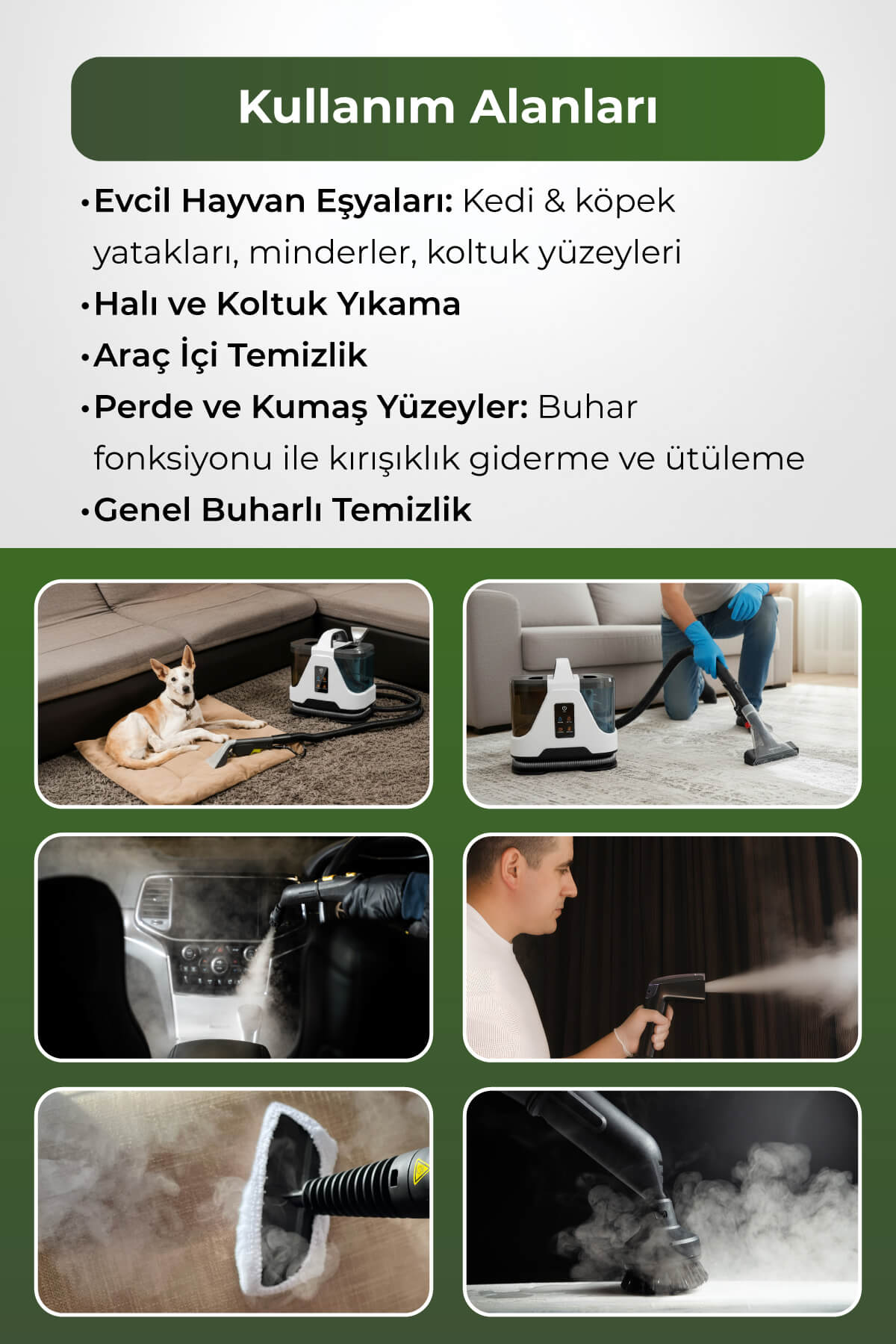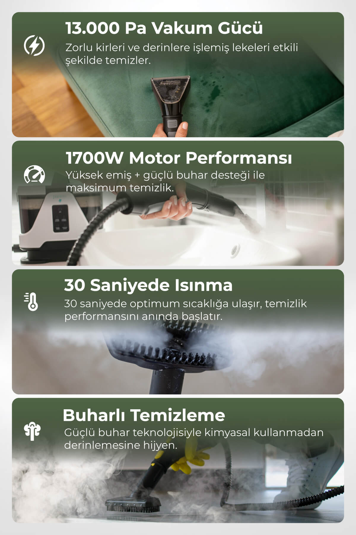Buharlı temizleme teknolojisi ile hijyenik temizlik sağlar
